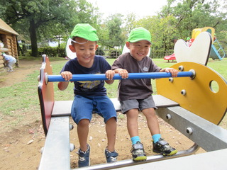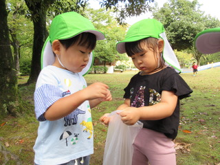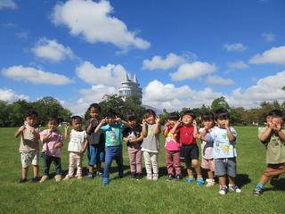 園バスに乗ってグリーンセンターに行ってきました。到着すると元気いっぱいに歩き、滑り台をしたり落ち葉やドングリを拾ったり広い芝生の上を思い切り走ったりして楽しみました。お弁当の時間になると嬉しそうに見せ合う姿も見られました♡秋の自然の中で友達と過ごした楽しい思い出がまた一つ増えました。