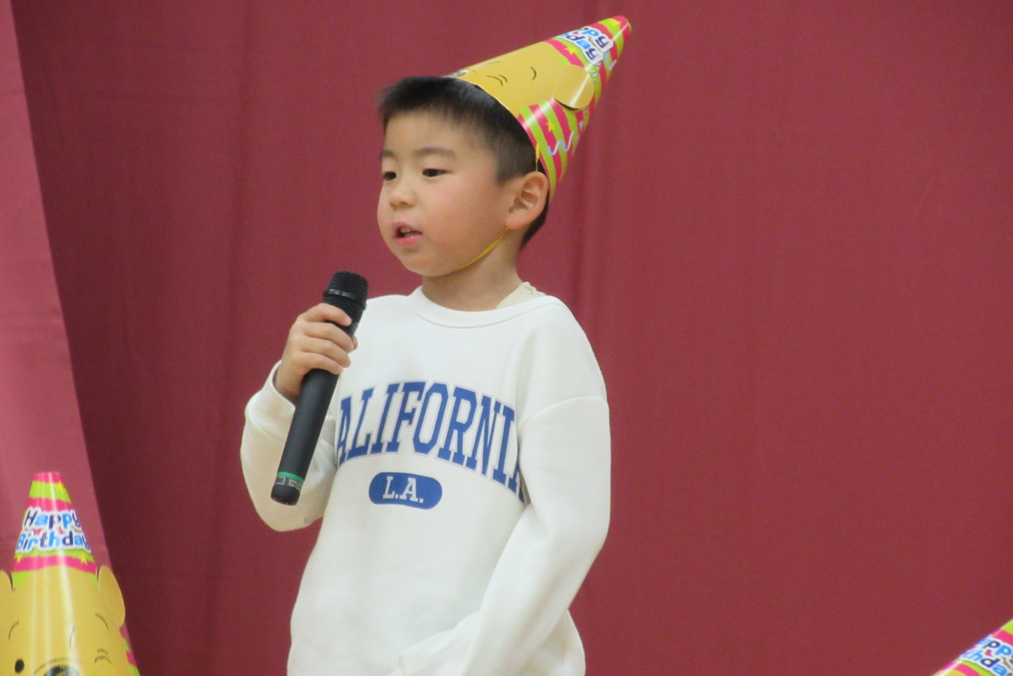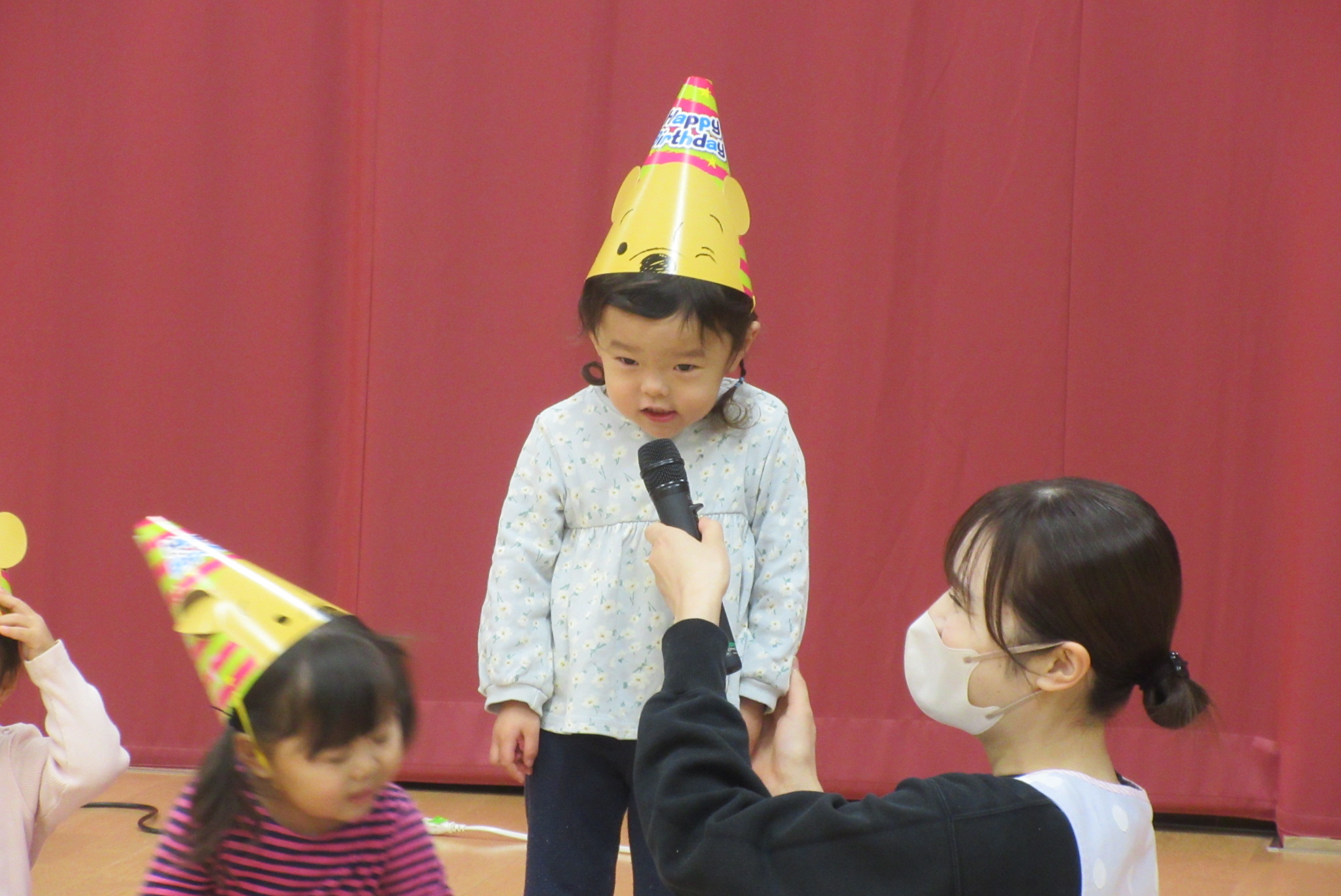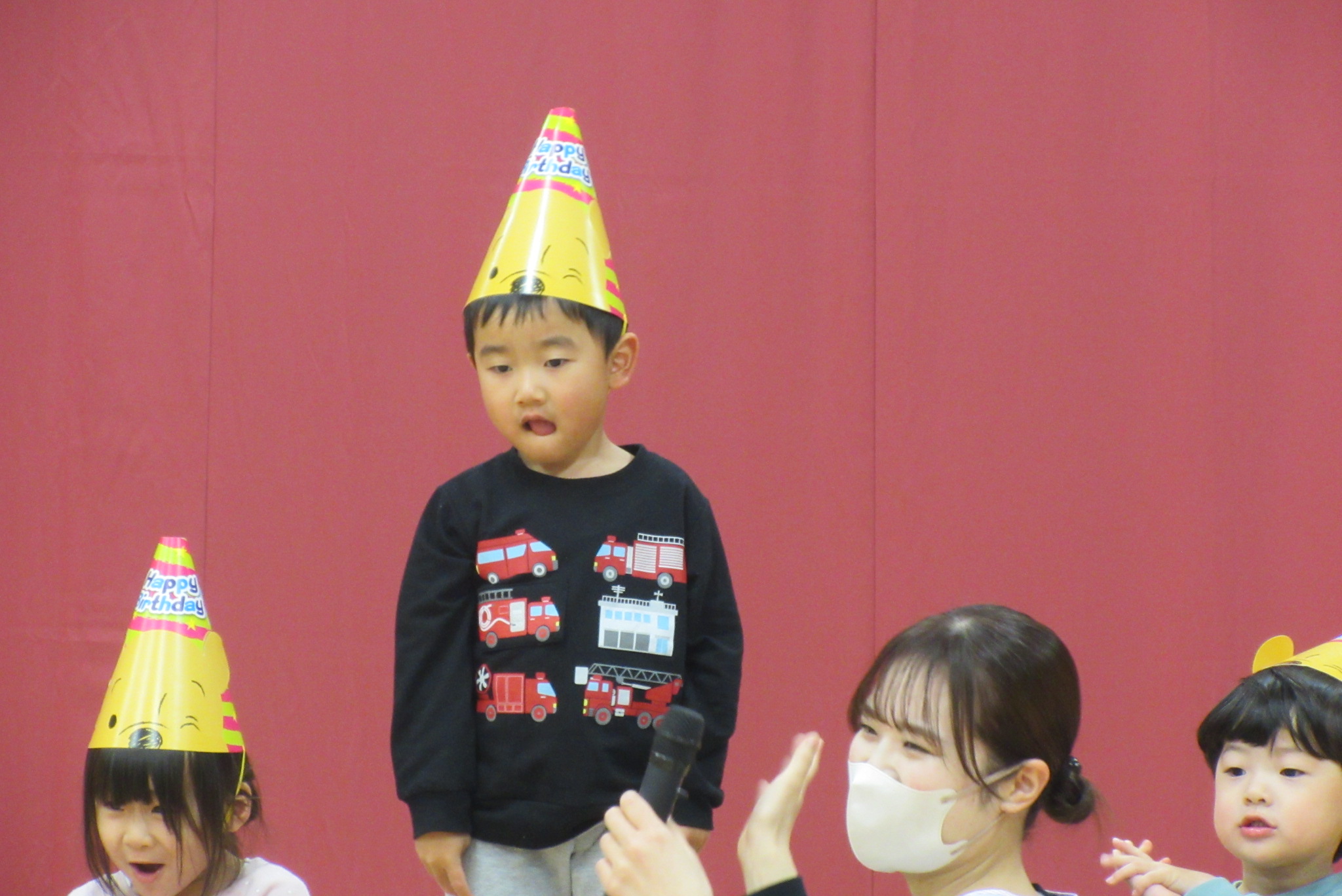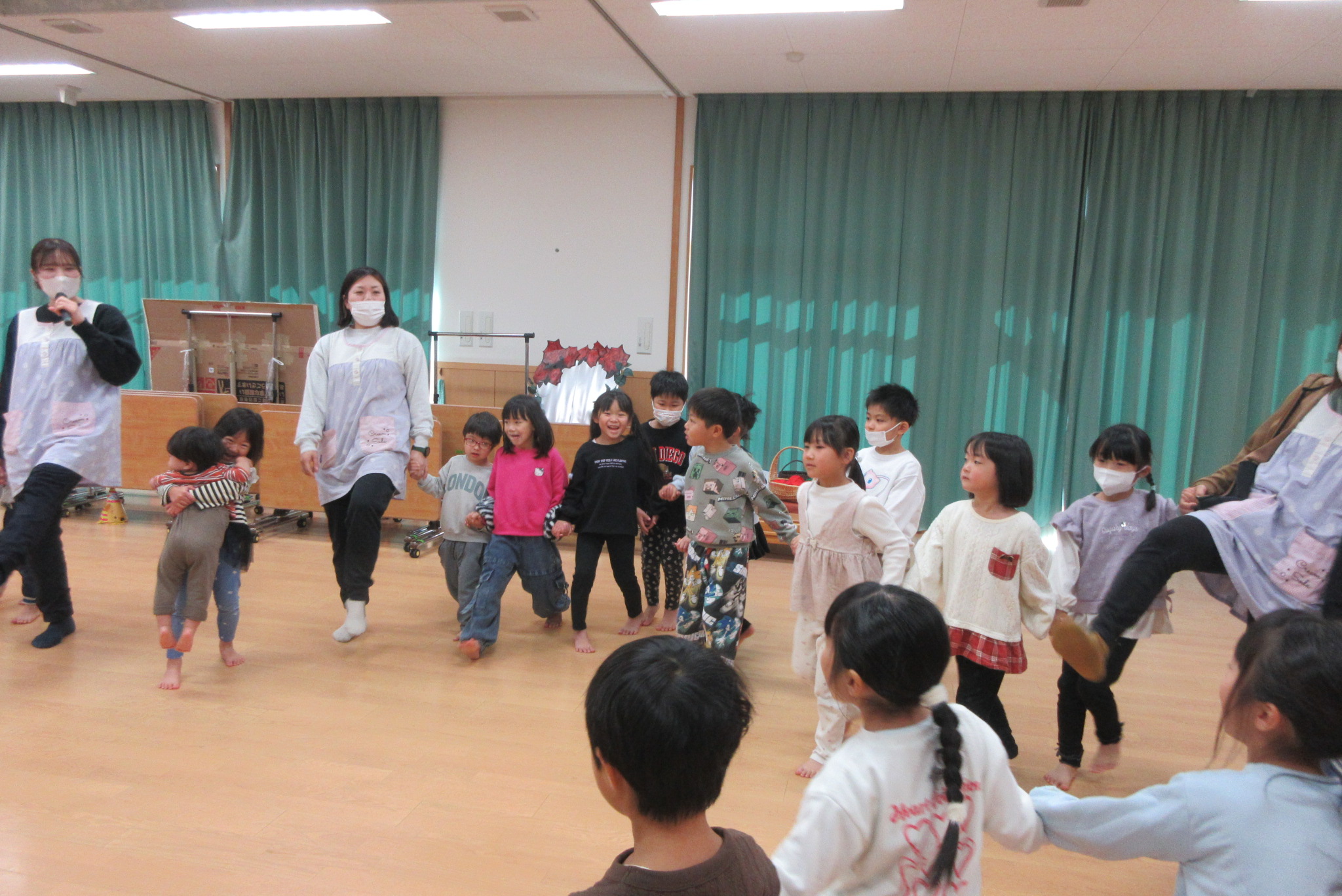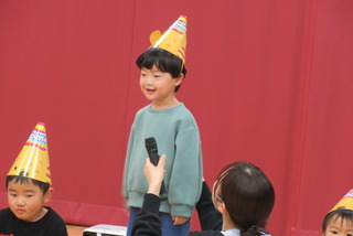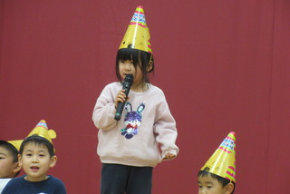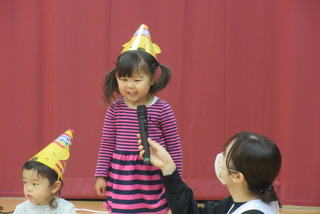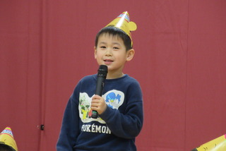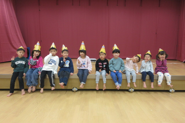 12月生まれのお友だちの誕生会がありました。10名の誕生児を紹介してお祝いした後は影絵クイズ!!手を使ったうさぎやティラノサウルスの人形などを使ったシルエットクイズは全問正解でした。 最後に♪ジングルベルを踊って楽しみました。サンタさんに聞こえたかな?