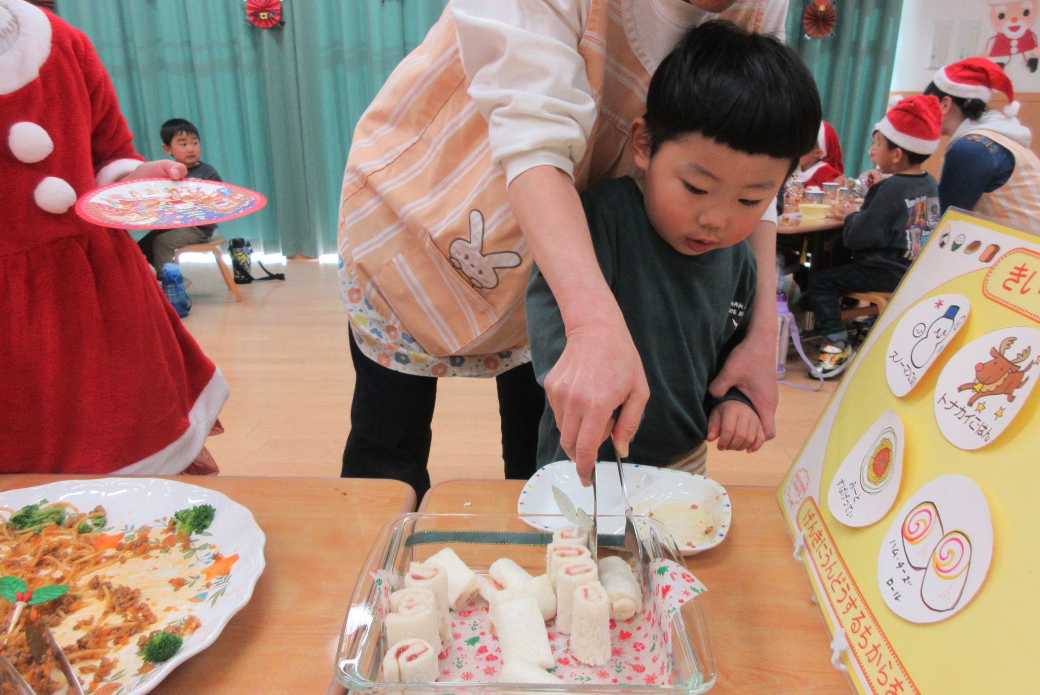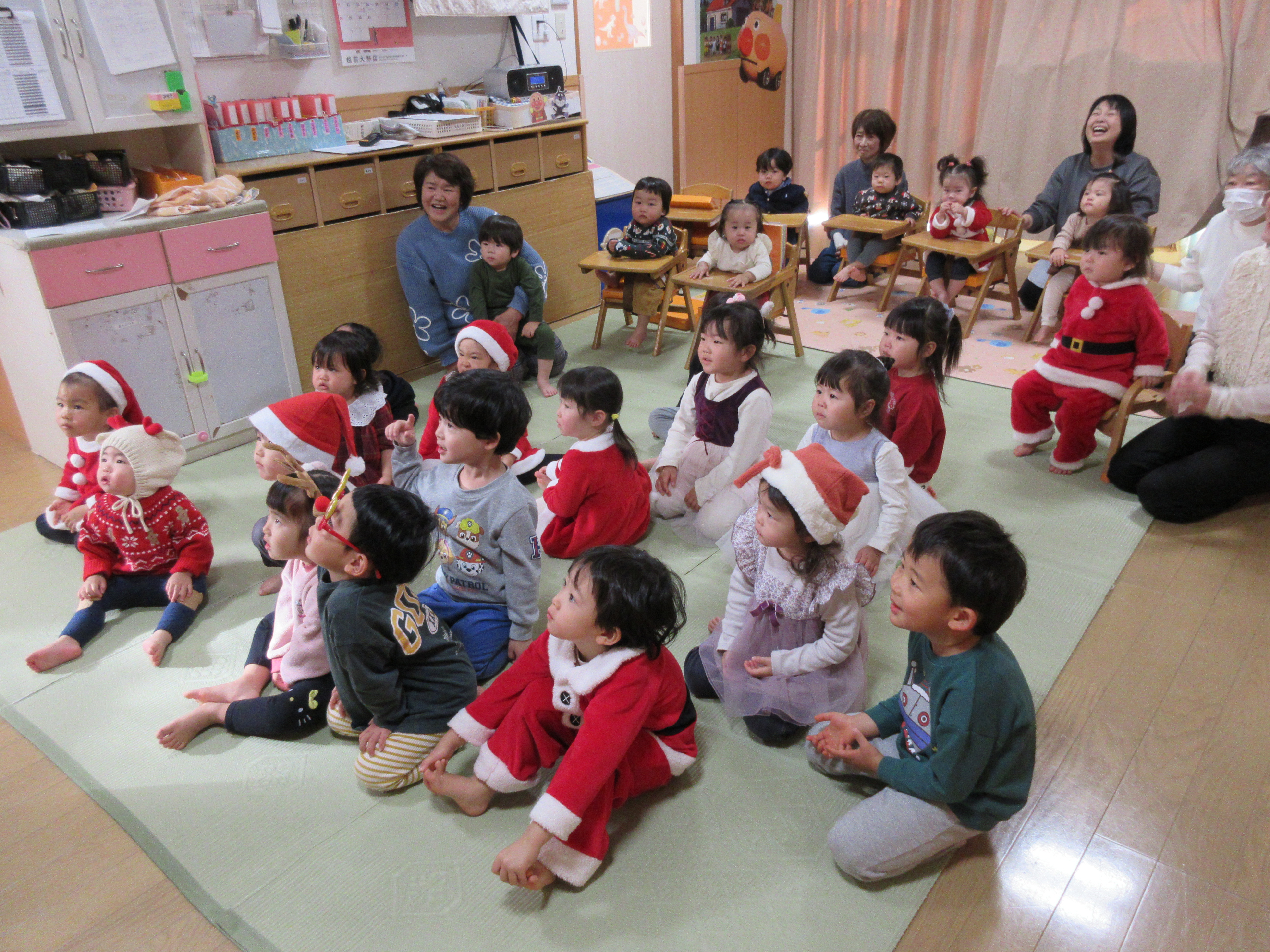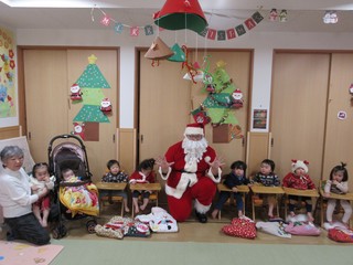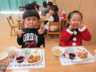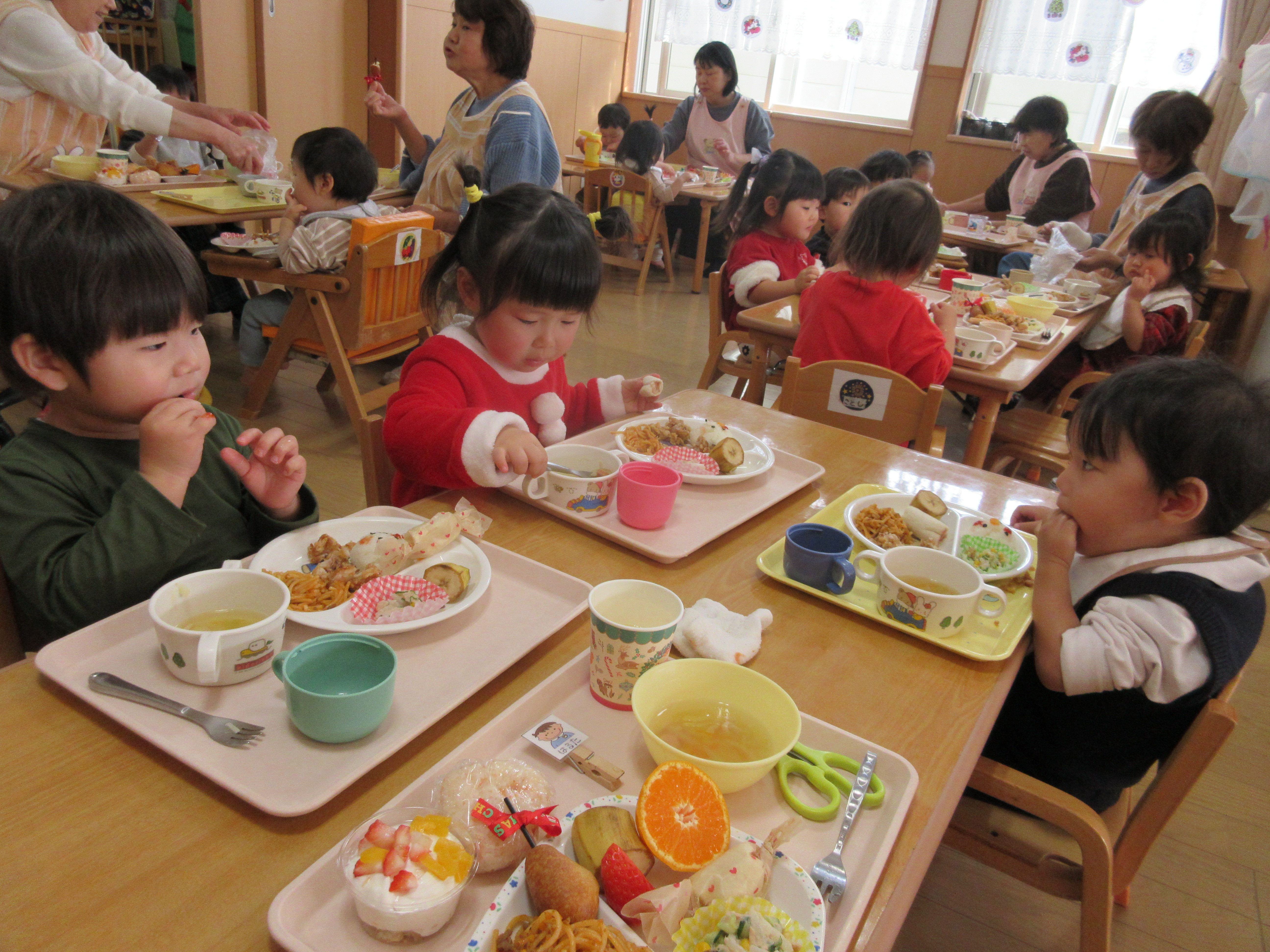 クリスマス会では大きなサンタさんに少しびっくりしてしまう子もいましたが、プレゼントを貰うとにっこり嬉しそうな子どもたちでした😊 いちご組はランチルームでのバイキングデビューをし、たくさんのメニューに目をキラキラさせる子がいたり、保育者と一緒におかわりに行ったりと、お腹いっぱいに食べてみんな満足そうでした♡ もも組さんもクリスマスの曲が流れる中、楽しい雰囲気で食べていました♪