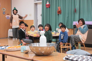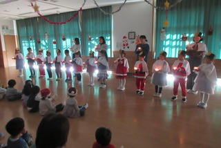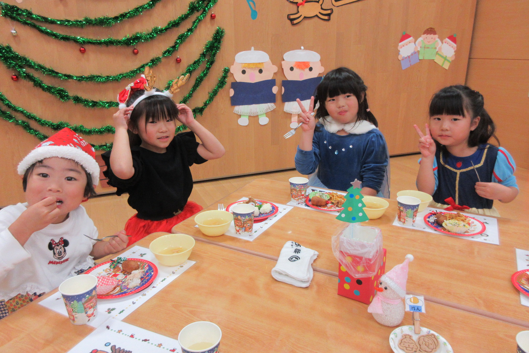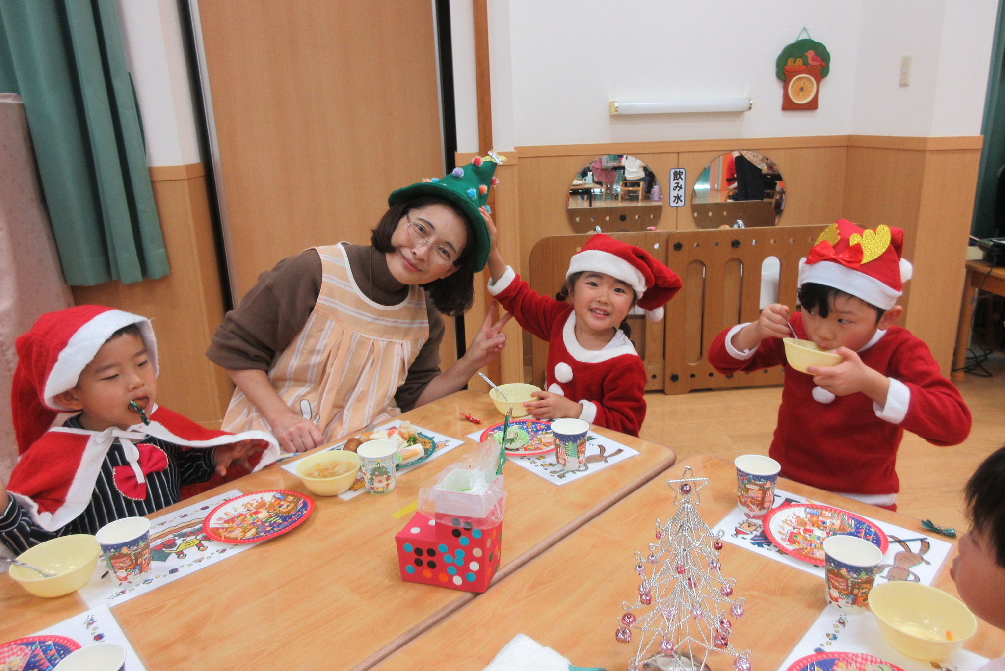 先生たちのクリスマスコンサートもあり、知っている曲があるとノリノリで歌って楽しんでくれました♪そして、バイキングではかわいいサンタの形のご飯や、リースの形のしゅうまいと沢山の素敵なご馳走をお腹いっぱいに食べました😊