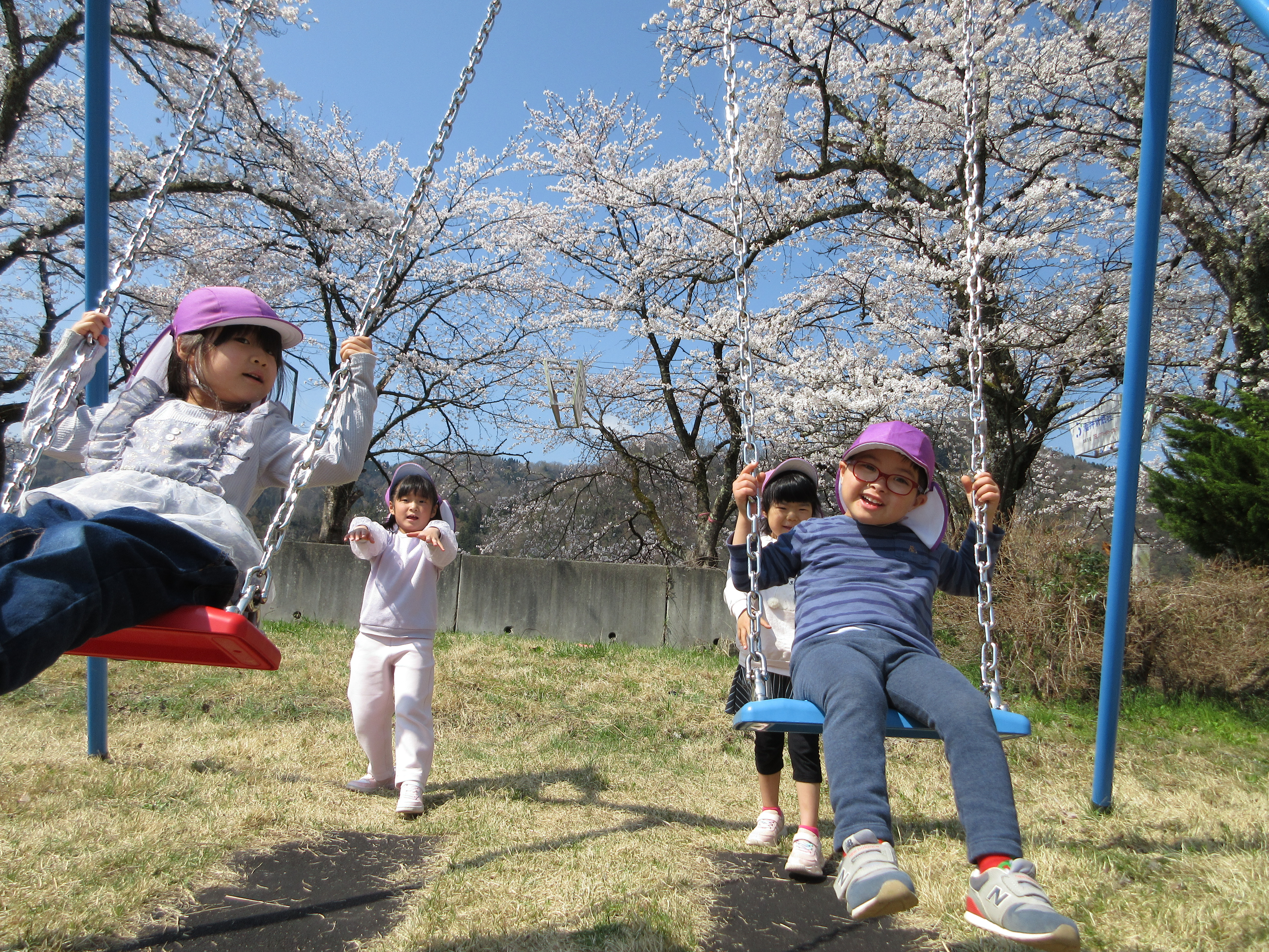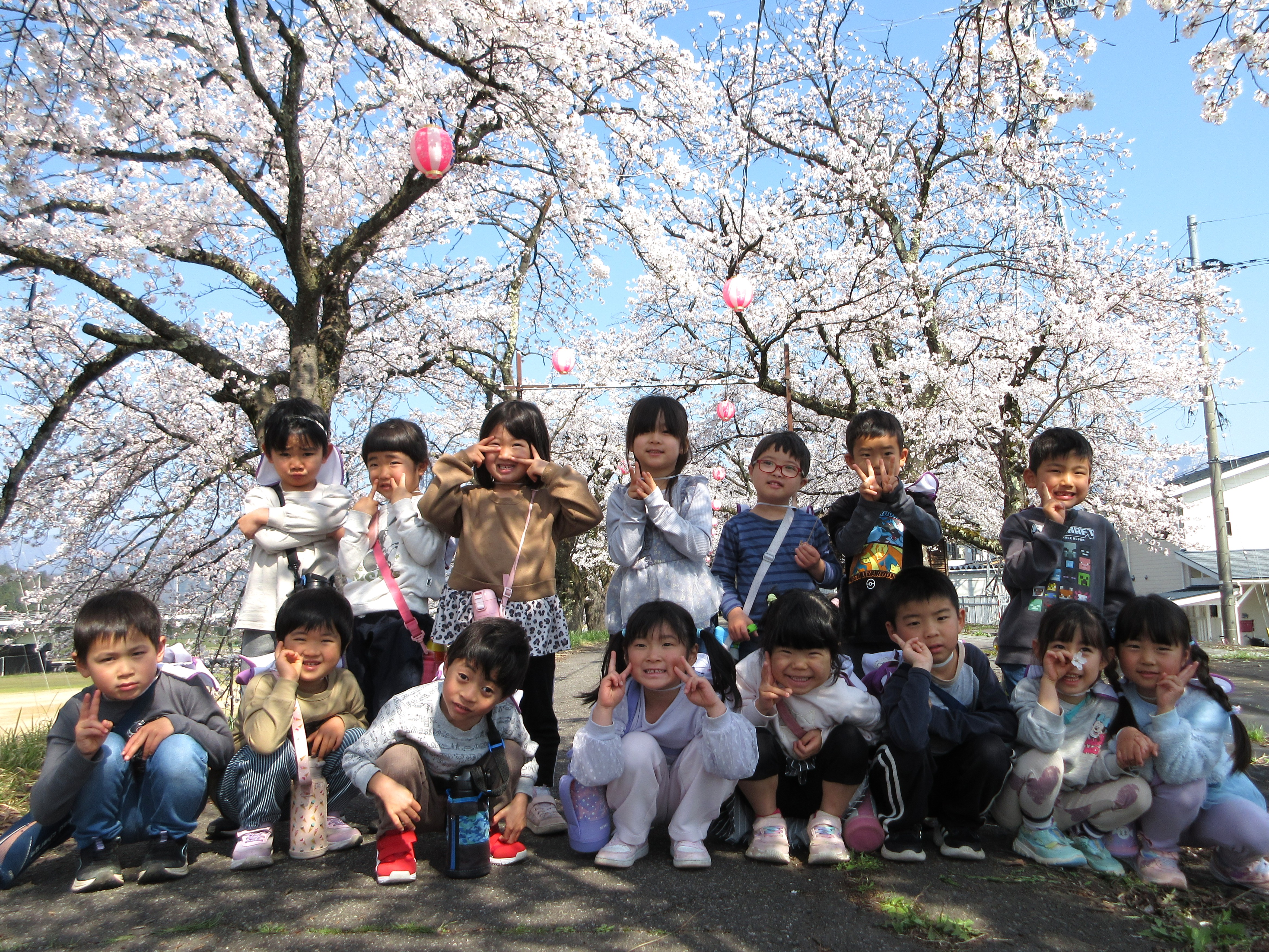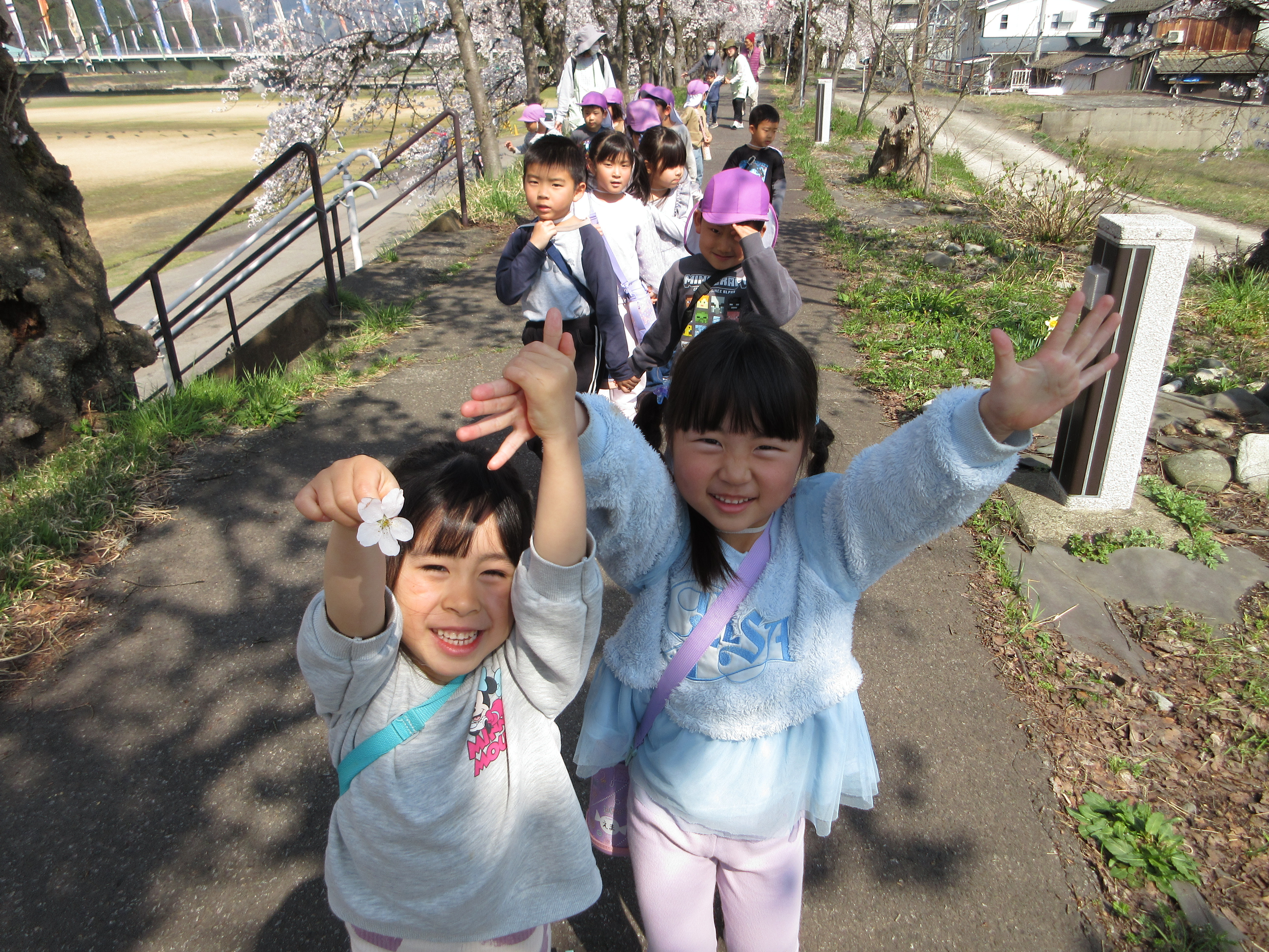 ぽかぽかで良いお天気なので勝山の弁天桜を見に行ってきました!満開の桜がとってもきれいで「ピンク色きれい💛」と喜んでいる子や「お土産にする!」と拾っている子もいました。桜の下をたくさん歩いていくと公園を発見!とっても嬉しそうに遊んでいました。道行く人にも元気いっぱいに挨拶をする素敵なあお組さんでした。