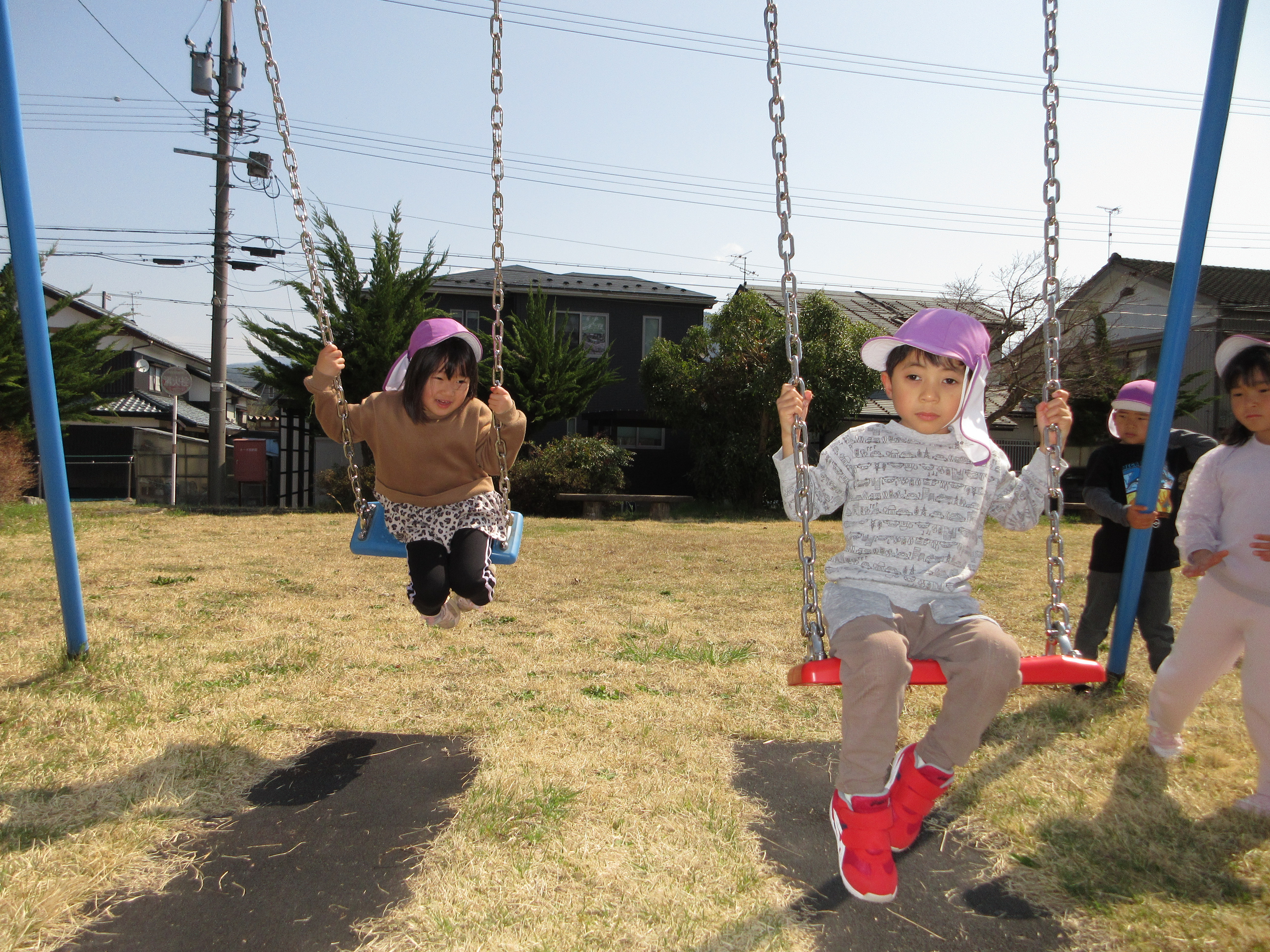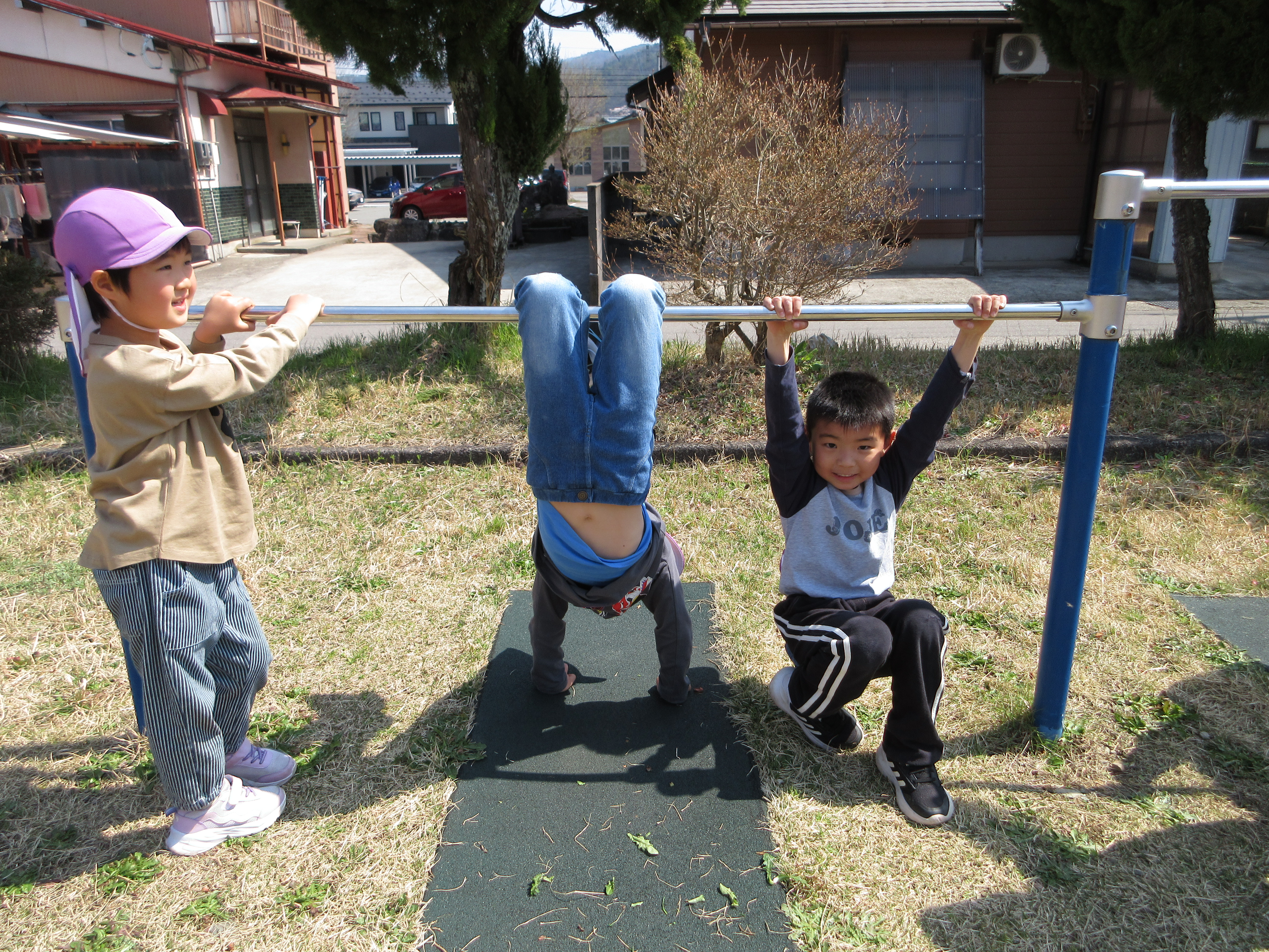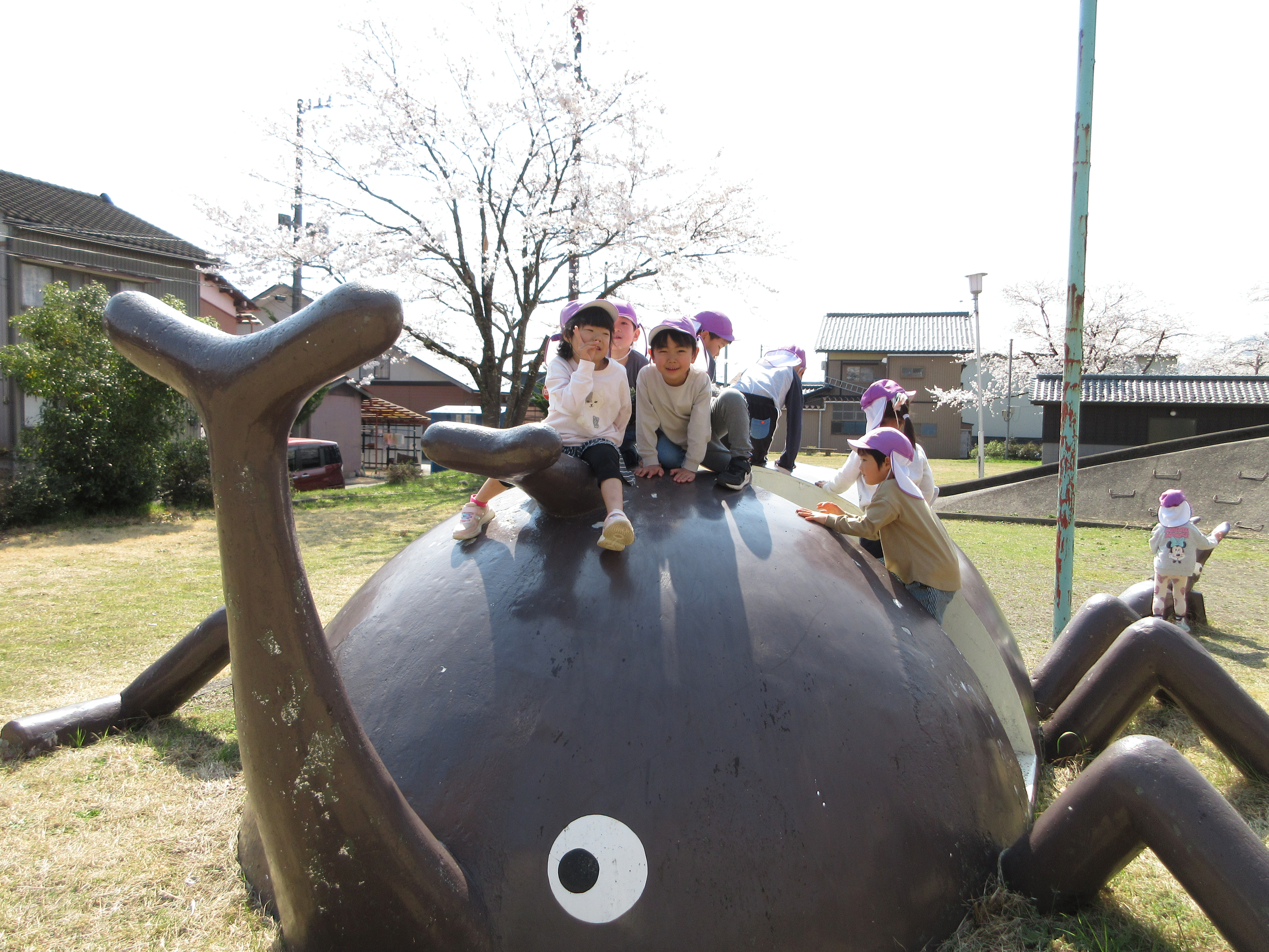 ぽかぽかで良いお天気なので勝山の弁天桜を見に行ってきました!満開の桜がとってもきれいで「ピンク色きれい💛」と喜んでいる子や「お土産にする!」と拾っている子もいました。桜の下をたくさん歩いていくと公園を発見!とっても嬉しそうに遊んでいました。道行く人にも元気いっぱいに挨拶をする素敵なあお組さんでした。