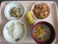 ぎょうざのあんかけ 炒り豆腐 みそ汁(切干大根) ごはん バナナ |