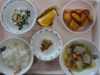 白身フライ 納豆 ほうれん草の白和え 肉団子スープ ごはん はっさく |