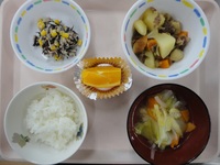 牛肉とじゃが芋の煮物 切干大根とひじきのサラダ みそ汁(キャベツ・揚げ) ごはん オレンジ |