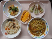 ちくわの磯部揚げ 白菜のおかか和え 和風カレーうどん きのこごはん オレンジ |