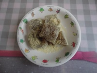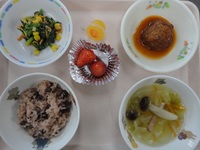 | ぱりんこ | ハンバーグソース煮 青菜とコーンのごま和え キャベツのベーコンスープ 赤飯 ゼリー いちご |