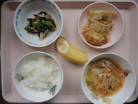 餃子のあんかけ 小松菜とじゃこの和え物 ビーフンスープ ごはん バナナ |