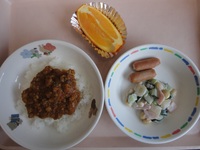 ウインナー 大豆とこんにゃくのサラダ ドライカレー ごはん オレンジ |