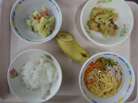 ハニースパイシーチキン マセドアンサラダ 五目そうめん ごはん バナナ |
