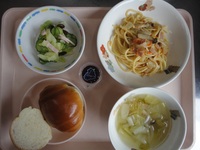 ナポリタン 小松菜サラダ 玉ねぎとベーコンのスープ ロールパン グレープフルーツ |