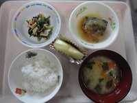 鯖のおろし煮 ほうれん草とささみの酢和え みそ汁(さつま芋) ごはん りんご |