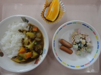 ウインナーソテー 大豆とこんにゃくのサラダ カレーシチュー ごはん オレンジ |