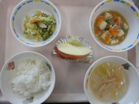 マーボー豆腐 ごま酢キャベツ 中華スープ ごはん りんご |