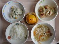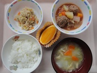 ミートボールのトマト煮 卯の花 みそ汁(キャベツ、あげ) ごはん オレンジ |