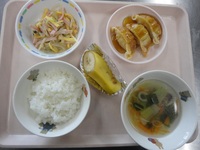 餃子のあんかけ 冷ばん三すう しめじとチンゲン菜のスープ ごはん バナナ |