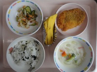 白身フライ キャベツのおかか和え クリームシチュー わかめごはん バナナ |