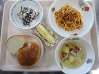 ナポリタン ひじきサラダ 玉ねぎとベーコンのスープ ロールパン りんご |