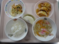 餃子のあんかけ キャベツの昆布和え ラーメン ごはん 梨 |
