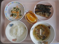 | バナナヨーグルト | さんまのかば焼き 切干大根のごま酢和え わかめスープ ごはん オレンジ |