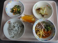 ハニースパイシーチキン 青菜とコーンのごま和え 五目そうめん わかめごはん オレンジ |