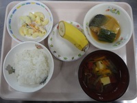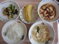 野菜たっぷり夏マーボー 小松菜とじゃこの和え物 ニラ卵スープ ごはん バナナ |
