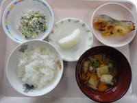 白身魚の西京焼き ほうれん草の白和え 白はんぺんのすまし汁 ごはん 梨 |