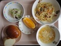 チキンときのこのクリームパスタ コールスローサラダ コーン卵スープ ロールパン オレンジ |
