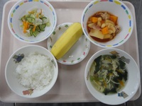 ポークビーンズ ごま酢キャベツ 五目スープ ごはん バナナ |