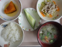 豚しゃぶの玉ねぎソース カボチャ煮 冷やしみそ汁 ごはん メロン |