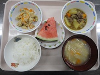 肉じゃが(カレー味) 卯の花 みそ汁(きゃべつ、あげ) ごはん すいか |