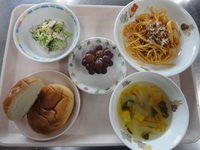 ミートスパゲティ ブロッコリーと卵のサラダ わかめスープ(コーン、玉ねぎ) ロールパン ぶどう |