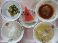 ハンバーグソース煮 オクラのおかか和え キャベツのベーコンスープ ごはん すいか |