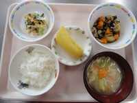 じゃが芋のひじき煮 小松菜サラダ みそ汁(キャベツ・あげ) ごはん バナナ |
