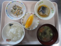鯖の梅干し煮 炒り豆腐(ツナひじき) 冷やしみそ汁 ごはん オレンジ |