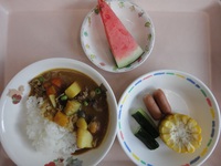 ウインナーソテー ゆでとうもろこし きゅうり カレーシチュー ごはん バナナ |