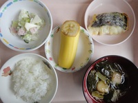 | リンゴゼリー | 焼き鯖(半夏生鯖) さつま芋ときゅうりの酢の物 冷たいすまし汁 ごはん グレープフルーツ |