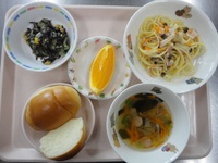 チキンときのこのクリームパスタ ひじきときゅうりのサラダ わかめスープ ロールパン オレンジ |