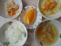 ポテトとコーンの重ね煮 鶏ささみと野菜のたっぷり和え 野菜とウインナーのスープ ごはん オレンジ |