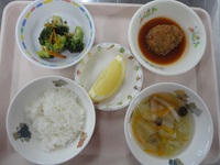 ハンバーグソース煮 ブロッコリーのおかか和え キャベツのベーコンスープ ごはん グレープフルーツ |