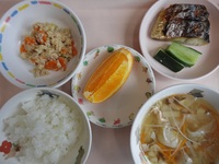 焼き鯖 スティックキュウリ 卯の花 ビーフンスープ ごはん オレンジ |