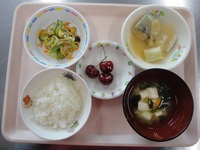 鯖の味噌煮 かみかみサラダ みそ汁(えのき) ごはん アメリカンチェリー |