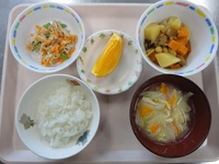 大豆の五目煮 にんじんのじゃこごま和え みそ汁(うすあげ) ごはん オレンジ |