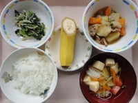 肉じゃが ほうれん草ともやしのごま和え 卵豆腐の冷やし汁 ごはん バナナ |