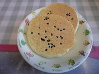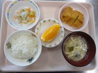 | 黒ゴマパンケーキ | とんかつ キャベツのゆかり和え みそ汁(切り干し大根) ごはん オレンジ |