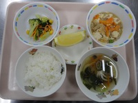 マーボー豆腐 ブロッコリーとコーンのごま和え しめじとチンゲン菜のスープ ごはん グレープフルーツ |