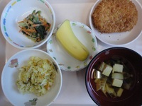 | ジャムロール | コロッケ ほうれん草の納豆和え 若竹汁 サバカレーピラフ バナナ |