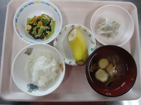 しゅうまい 小松菜と卵の炒め物 麩のすまし汁 ごはん バナナ |