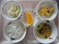 スパニッシュオムレツ スパゲティサラダ わかめスープ(中華) ごはん オレンジ |