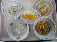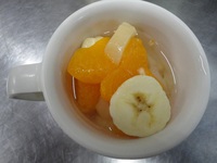 | フルーツポンチ | ちくわの磯部揚げ 大豆とこんにゃくのサラダ 煮込みうどん ゆかりごはん オレンジ |